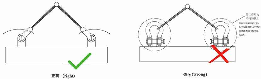 8.卸扣要正确的支撑着载荷,即作用力要沿着卸扣的中心线的轴线上,避免弯曲,不稳定的载荷,更不可以过载(如下图)。